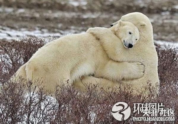 2011年2月,野生动物摄影师阿列克谢·季先科在加拿大北部马尼托巴湖上拍到了这一精彩瞬间。照片中,雪花弥漫的世界里,两只北极熊紧紧 地拥抱在一起,敦实一点的北极熊揽着自己的“爱人”,被揽着的北极熊乖乖地把头伏在它肩上,安静而甜蜜。“我简直不敢相信这一切。 ”阿列克谢说,当看到这温暖的一幕时,即使四周雪花弥漫,但他却不再感觉寒冷。
