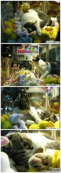 在台北永和一个游乐场里面,一台夹娃娃机里竟然发现了活生生的猫咪~游乐场老板说:这只猫咪是附近流浪的猫咪~天气冷了就自己跑夹娃娃机里面~来去自如还抱着娃娃睡觉的小猫咪实在太萌了!游乐场为了不让猫咪睡眠被打扰~这台机器只要猫咪去睡觉的时候也不开放使用的。