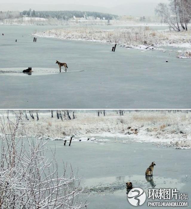 狗不离不弃救伙伴2011年11月,国外两只狗狗一起在冰封的河面上玩耍,突然一只狗狗掉入了河里,另一只狗狗就一直守在边上,想去救同伴可是无能为力。于是就在边上狂吠,引来了路人,最终救起了自己的伙伴。