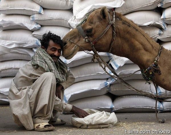 科学画报:14日,巴基斯坦,一头骆驼亲吻给自己喂食的主人