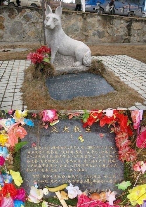 三十多个职工在煮一锅被毒死的狗的狗肉准备吃,赛虎嗅出了肉里有毒,拼命吠叫阻止人们去吃,但人们不明白,以为狗想吃肉,就扔给它几块,但赛虎不吃,还是不停吠叫,甚至开始哀嚎。最后,在人们要去吃肉时,这只狗狗流着泪,一声悲鸣,吃掉了地上的肉,当场中毒而死。九江市贺家山陵园总经理听说后非常感动,把赛虎移葬到贺家山陵园,为这只舍身救人的义犬建造了雕像。移葬那天,有一百多人冒雨自发为赛虎送行……